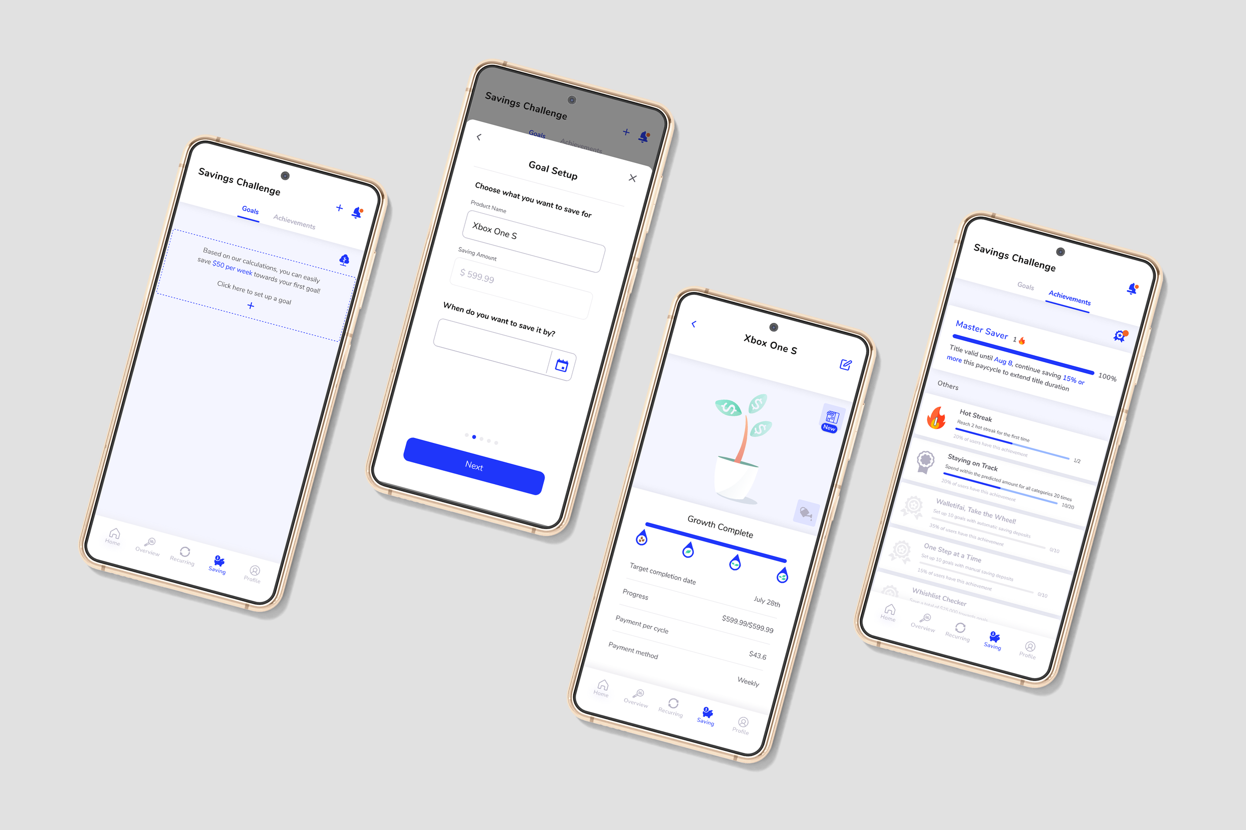 The Savings Challenge allows the user to create goals to save for. Users can choose to contribute automatically or manually at their own pace. In addition, completing goals and tasks can net users achievements and badges, making saving fun for everyone.